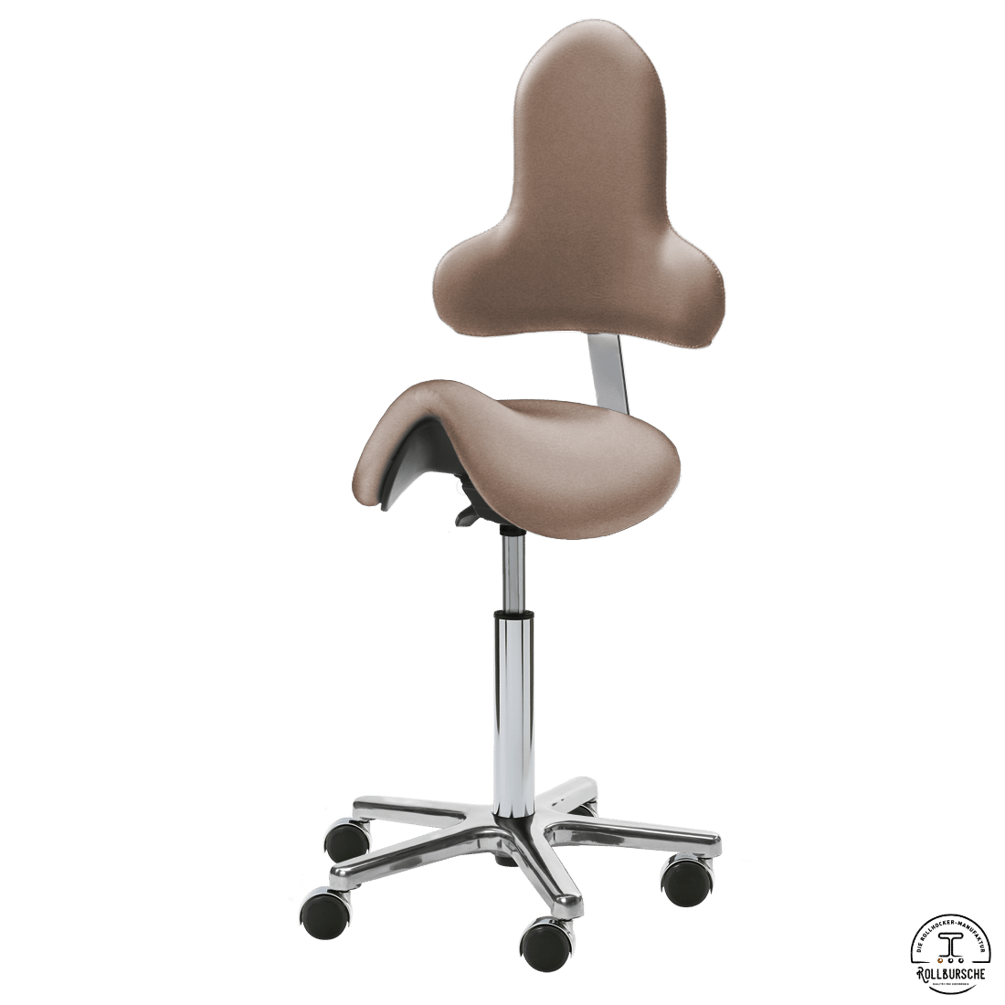 In der Version als Bürohocker Marios Trecking ist der Sattelsitz samt Rückenlehne Ergo mit dem Bezug SKAI Evida smoke gepolstert. Dieser Bezug erfüllt den Ökotex Standard 100, besteht zu weiten Teilen aus natürlichen Rohstoffen und hat eine sehr angenehme Haptik. Ausgestattet ist er zudem mit der Neigungsverstellung und der Rückenlehne Ergo, die deine Wirbelsäule komplett unterstützt und im Nierenbereich mit beiden Armen sanften Halt bietet.