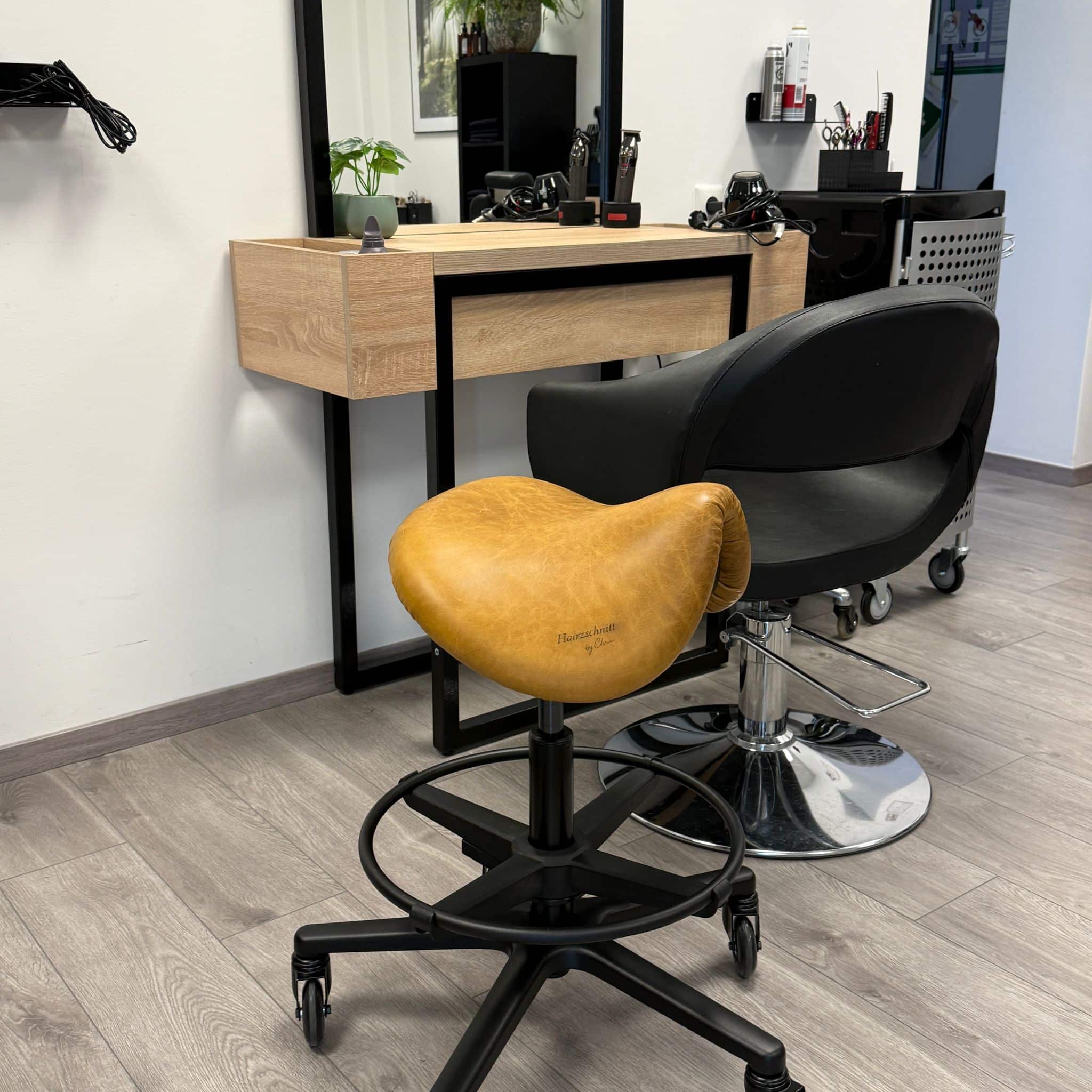 Der Friseurhocker “Hairzschnitt by Chris” mit einem schwarzen Unterbau und einem mega eleganten Echtleder-Top!