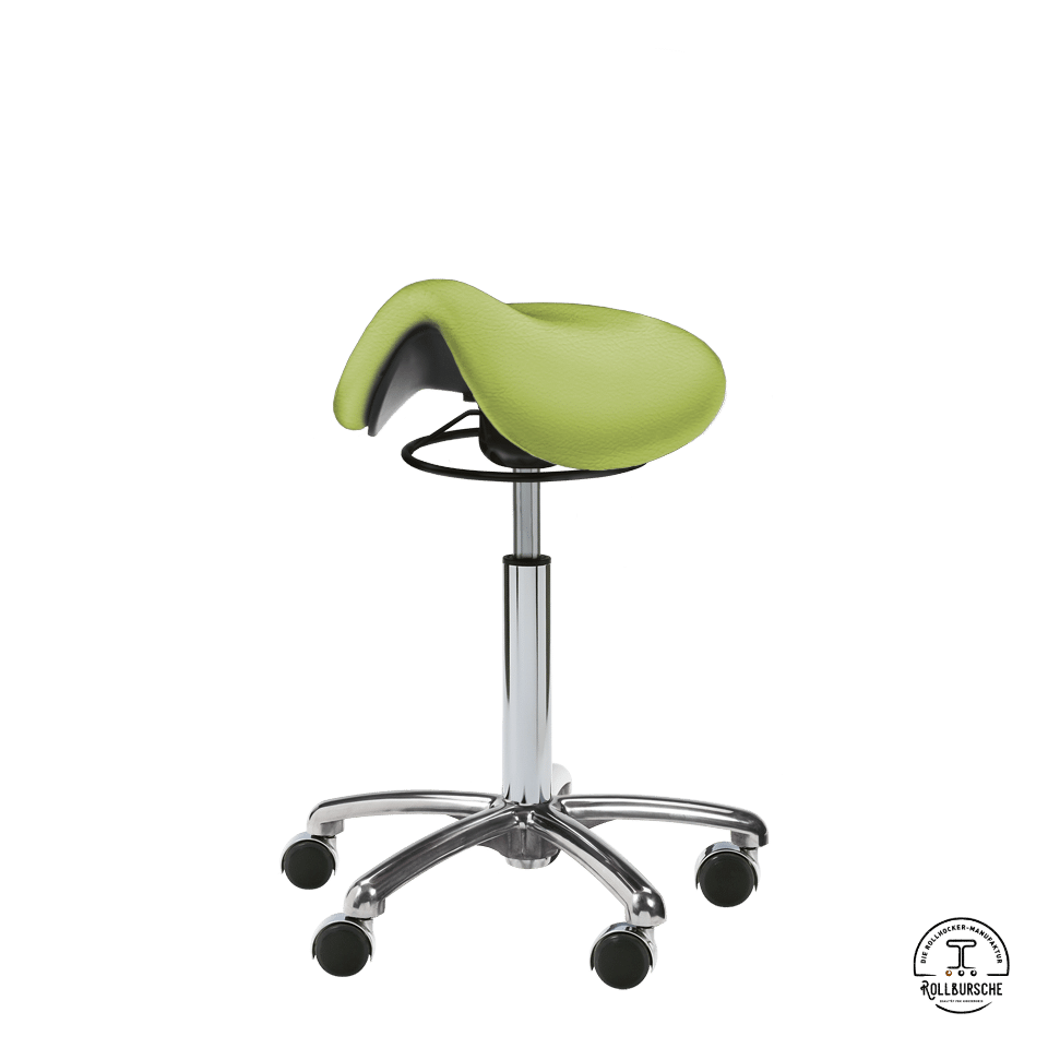 Der Praxishocker Annettes Trecking bezogen in Skai® Sotega Lightolive. Der Polsterbezugstoff in Softnappaqualität mit klassischer Ledernarbung. Für ergonomisches Sitzen bringt der Sattelsitz Rumpf und Oberkörper in einen offenen Winkel… Mittels schwarzer Ringauslösung ist die Höhenverstellbarkeit der mittleren Gasfeder schnell und rundum sichergestellt. Mit dem kleinen silbernen Basis Fußkreuz und lastabhängig gebremsten Deluxe Rollen (bei Belastung rollbar) mit Metall dabei auch noch edel und robust im Design. Dein Rollbursche bringt Farbe in die Praxis.