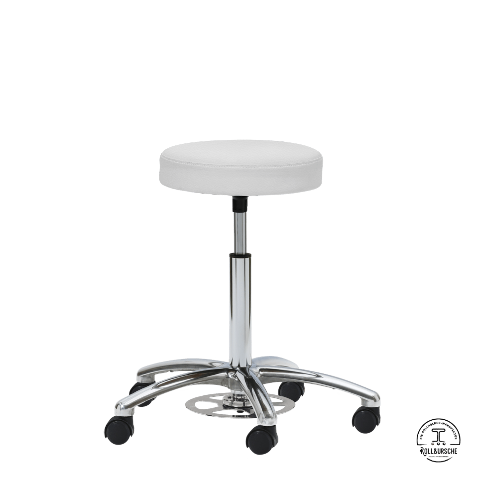 Der Praxishocker Rasmus Scandic kommt mit klassischem Rundsitz in Skai® Palma NF Weiss angerollt. Das Kunstleder überzeugt durch seine Struktur mit feiner Kalbsledernarbung und pflegeleichten sowie desinfektionsmittelbeständigen Eigenschaften. Richtig praktisch für Deine Praxis ist die Höhenverstellbarkeit der mittleren Gasfeder mittels Fußauslösung, so dass Du immer die Hände frei hast…Durch die gebremsten Stop Rollen bleibt Dein Rollbursche in Position beim Auf-und Absteigen. Außerdem zeichnen sich die Rollen durch ihren geräuscharmen Lauf aus und sind sehr schonend bei empfindlichen Böden. (Achtung: Wird mit Fußauslösung geliefert. Zusätzliche Hebeltechnik exklusiv im Preis enthalten)