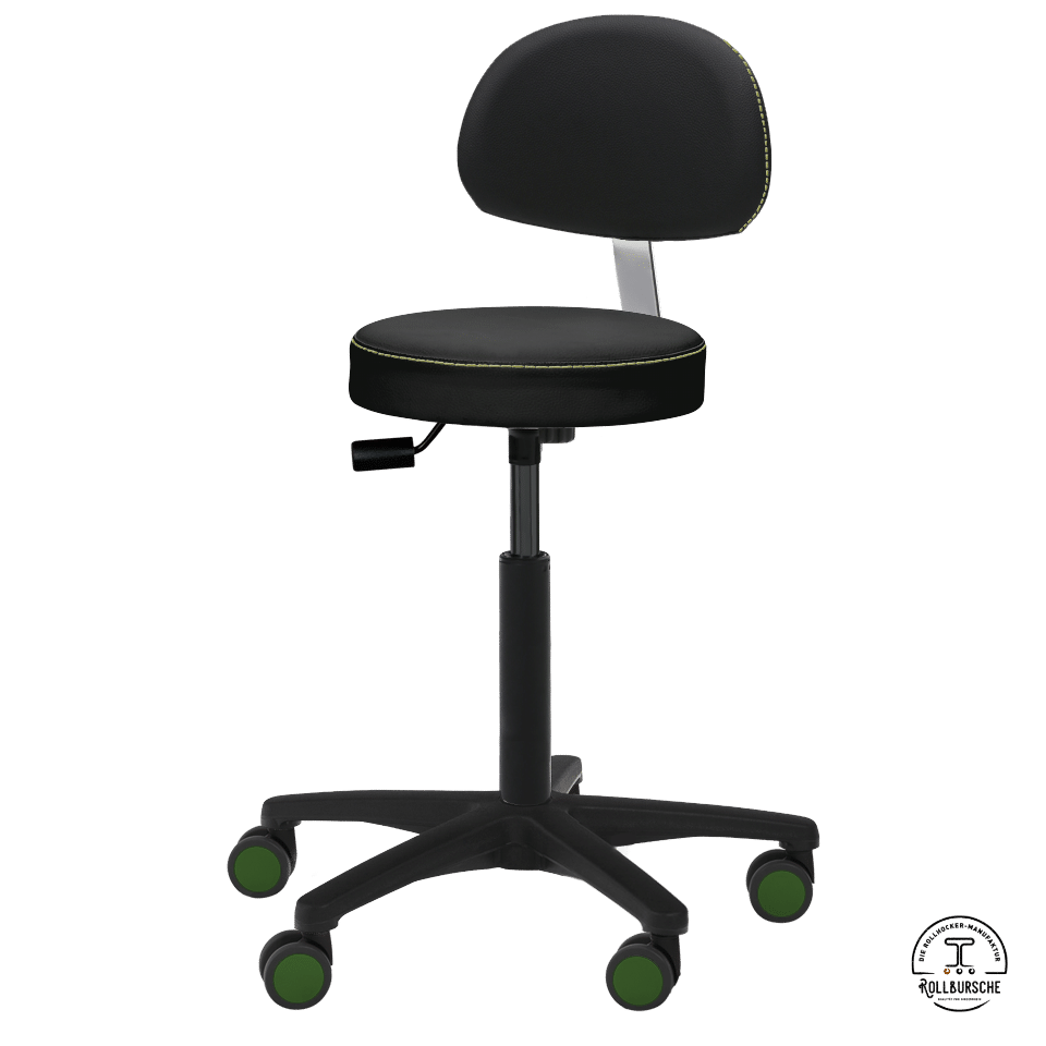 Dein Rollbursche kommt zwar klassisch schwarz daher mit unserem standardmäßigen Dakota Kunstleder, der mittleren Gasfeder, dem kleinen Matar Kunststoff-Fußkreuz und ungebremsten Double Rollen (alles in schwarz), wird jedoch gekonnt aufgepeppt durch die farblich abgesetzte Ziernaht auf Sitz und Rückenlehne in der Farbe Limone. Als zusätzliches Highlight strahlen die Abdeckungen der Double Rollen in kräftigem Farngrün.